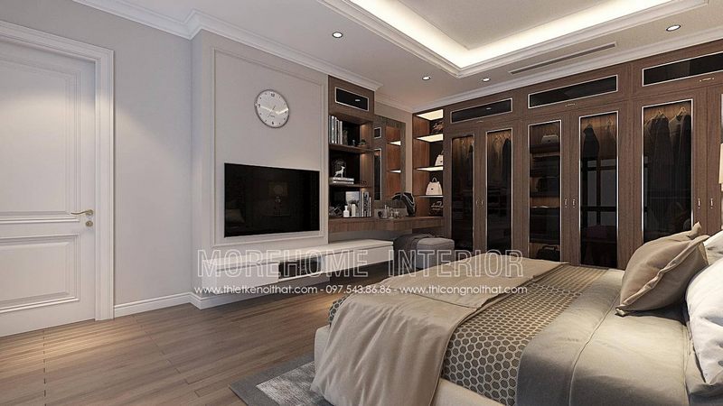 Morehome gợi ý cho khách hàng mẫu tủ quần áo âm tường gỗ óc chó tự nhiên phong cách tân cổ điển trong nhà biệt thự cao cấp